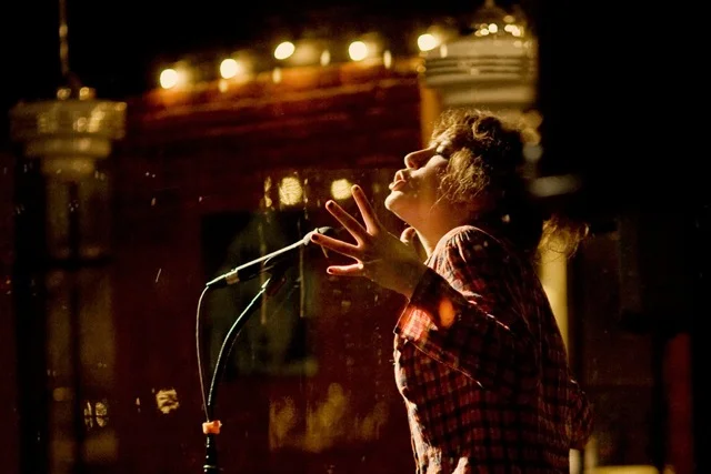 (Above photo: Author Sara Barron speaking at the Monti story slam at Alivia’s Bistro in Durham, 2009. By D.L. Anderson.)